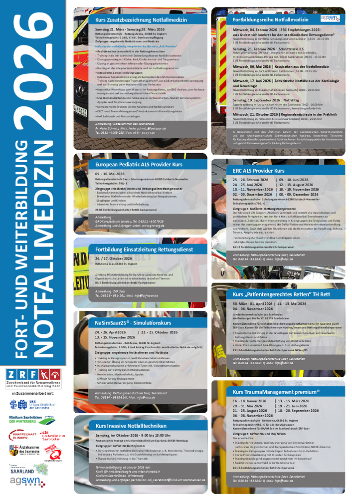 Gemeinsam mit der Arbeitsgemeinsachft Südwestdeutscher Notärzte (agswn) und den im Notarztdienst beteiligten, saarländischen Kliniken bietet der ZRF Saar die Fortbildungsreihe Notfallmedizin an.