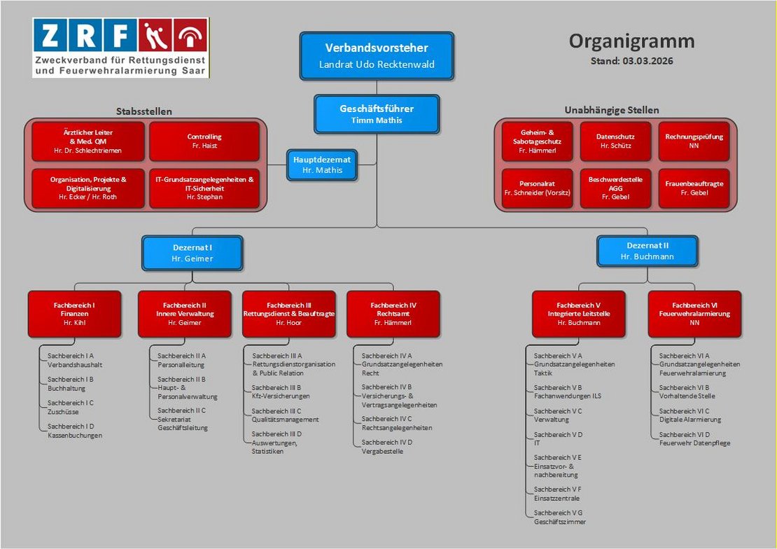 Verbandsvorsteher ist der Landrat des Landkreises St. Wendel, Udo Recktenwald. Stellvertretender Verbandsvorsteher ist der Landrat des Saarpfalz-Kreises, Frank John. Die laufenden Geschäfte sind dem Geschäftsführer Timm Mathis übertragen. Für das medizinische Qualitätsmanagement ist der Ärztliche Leiter Rettungsdienst, Sanitätsrat Dr. Thomas Schlechtriemen, zuständig.